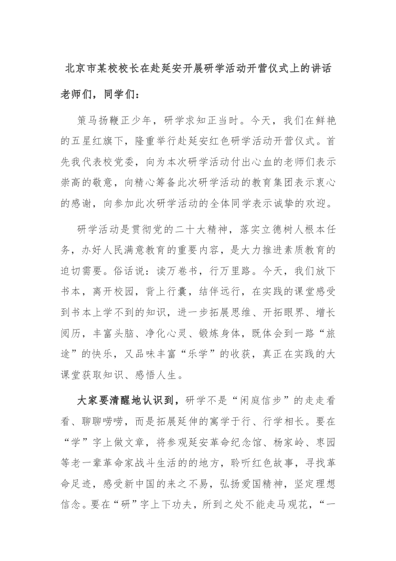 / 北京市某校校长在赴延安开展研学活动开营仪式上的讲话