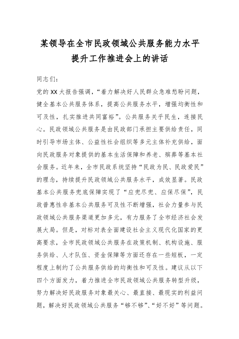 / 某领导在全市民政领域公共服务能力水平提升工作推进会上的讲话