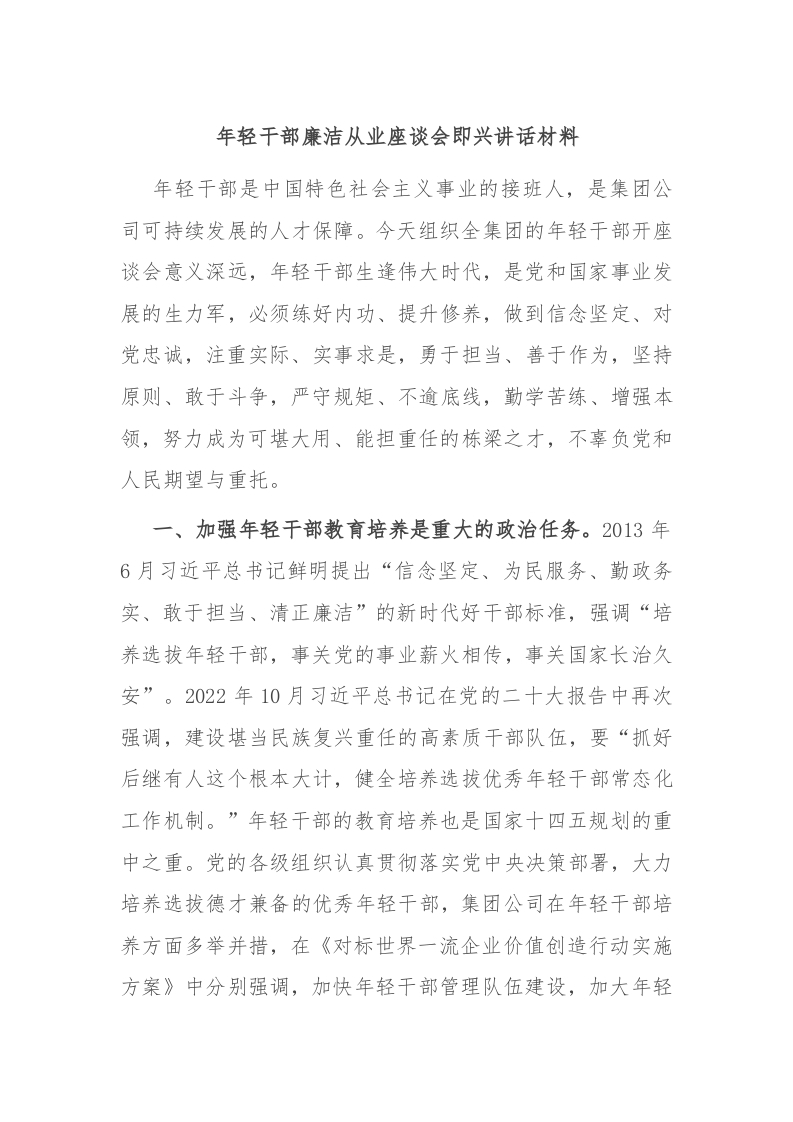 / 年轻干部廉洁从业座谈会即兴讲话材料