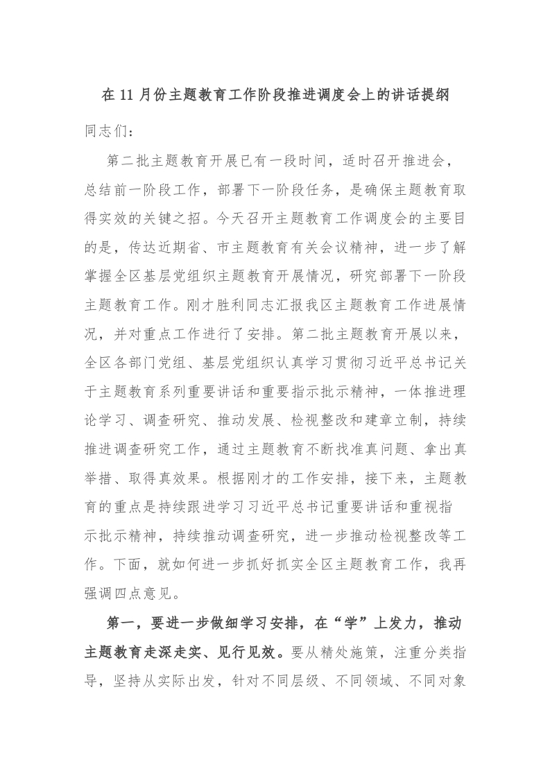 / 在11月份主题教育工作阶段推进调度会上的讲话提纲