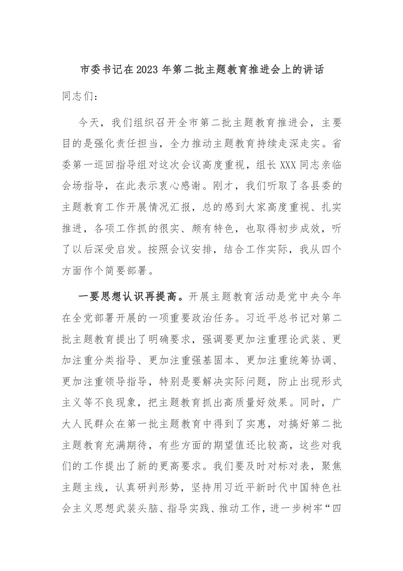 / 市委书记在2023年第二批主题教育推进会上的讲话