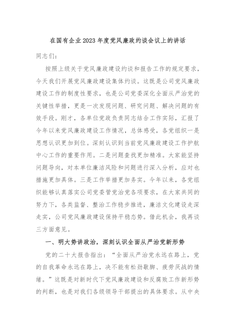 / 在国有企业2023年度党风廉政约谈会议上的讲话