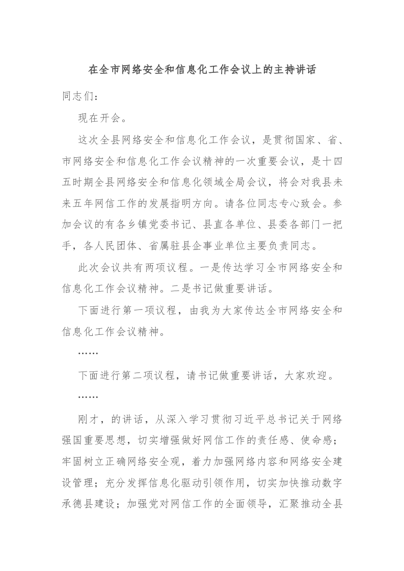 / 在全市网络安全和信息化工作会议上的主持讲话