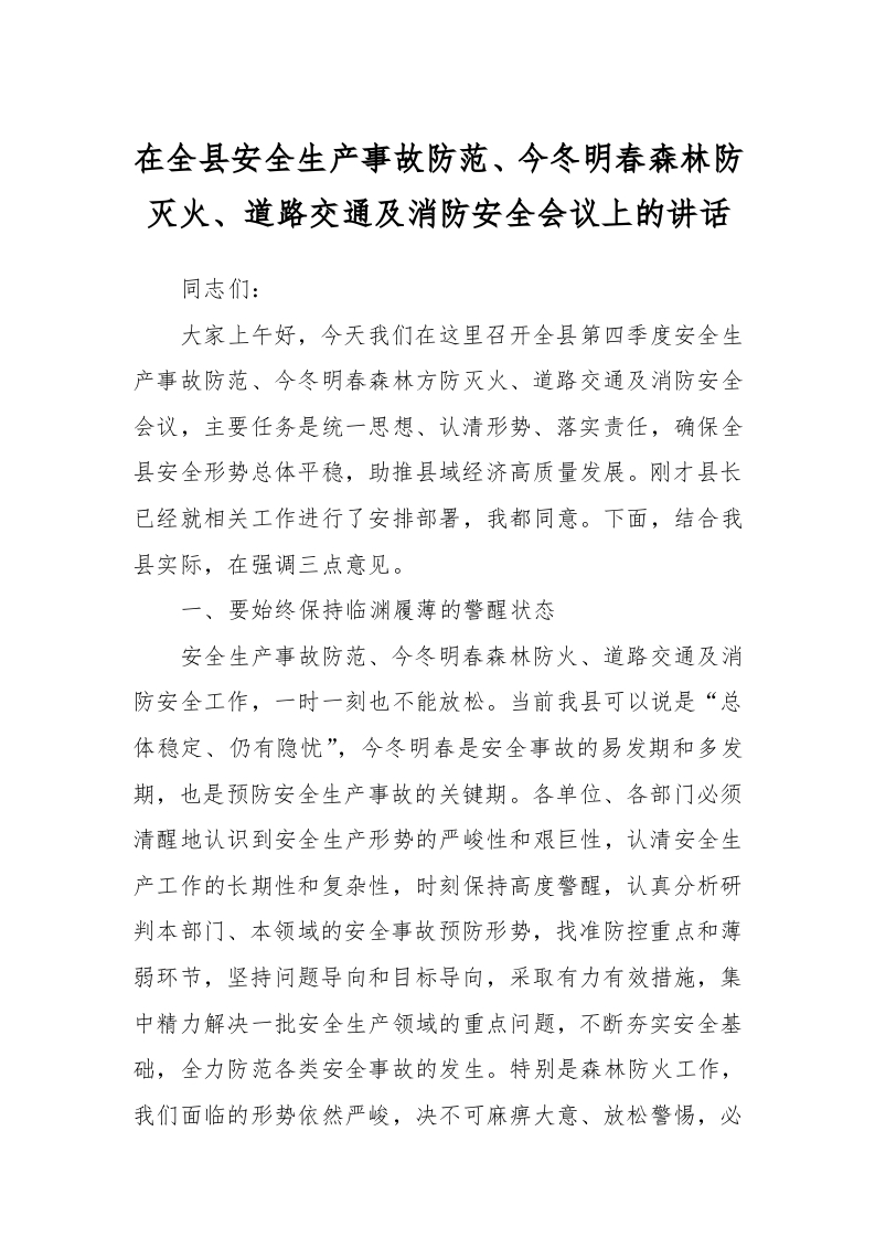 / 在全县安全生产事故防范、今冬明春森林防灭火、道路交通及消防安全会议上的讲话