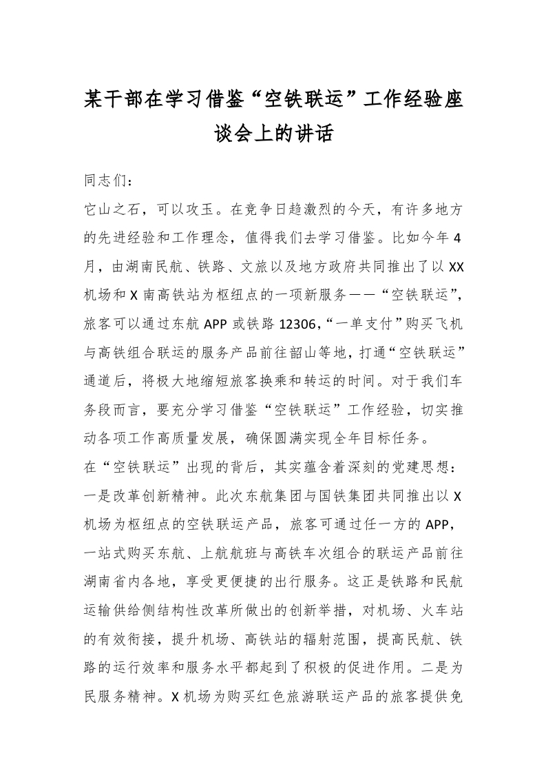 / 在学习借鉴“空铁联运”工作经验座谈会上的讲话