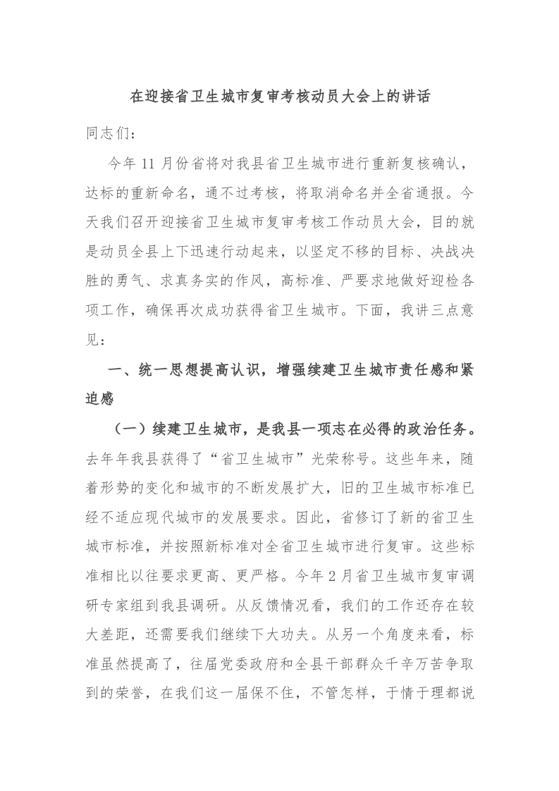 / 在迎接省卫生城市复审考核动员大会上的讲话