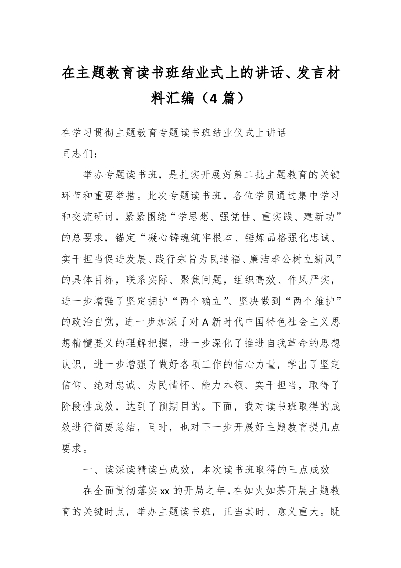 / (4篇)在主题教育读书班结业式上的讲话、发言材料汇编