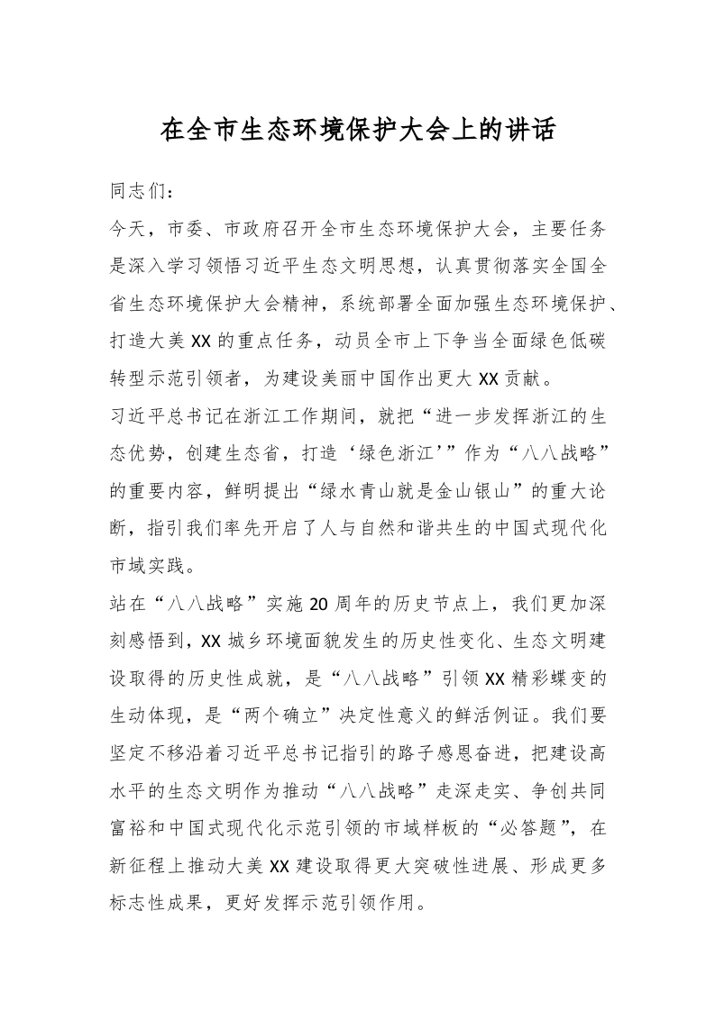 / 在全市生态环境保护大会上的讲话
