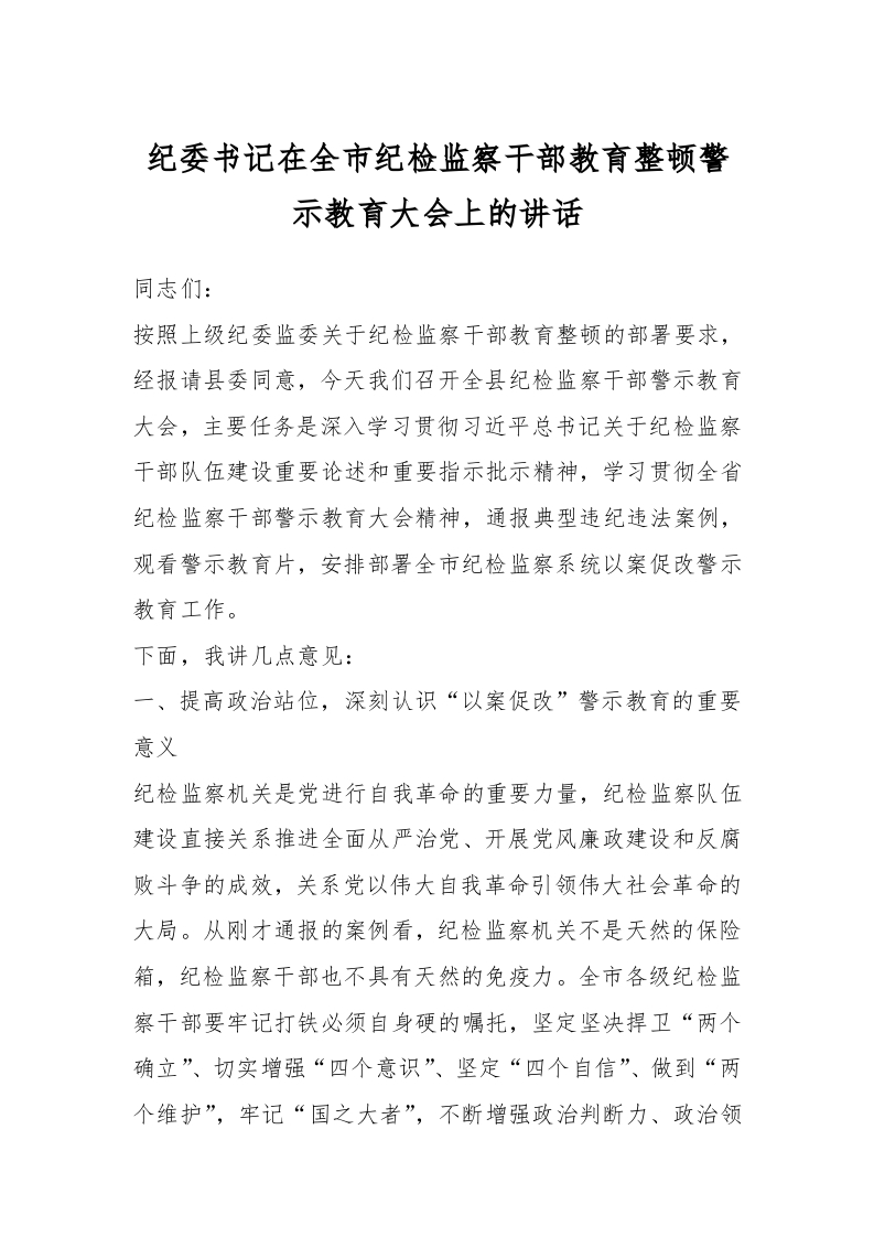 / 纪委书记在全市纪检监察干部教育整顿警示教育大会上的讲话