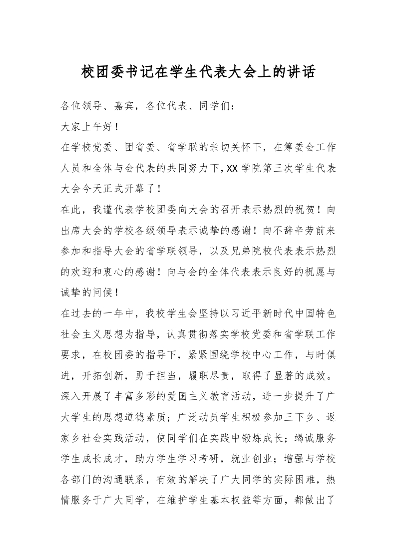 校团委书记在学生代表大会上的讲话