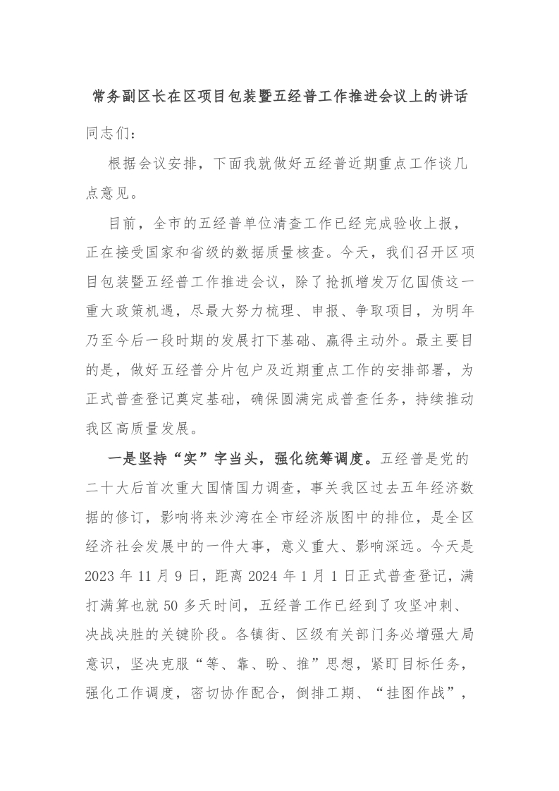 / 常务副区长在区项目包装暨五经普工作推进会议上的讲话