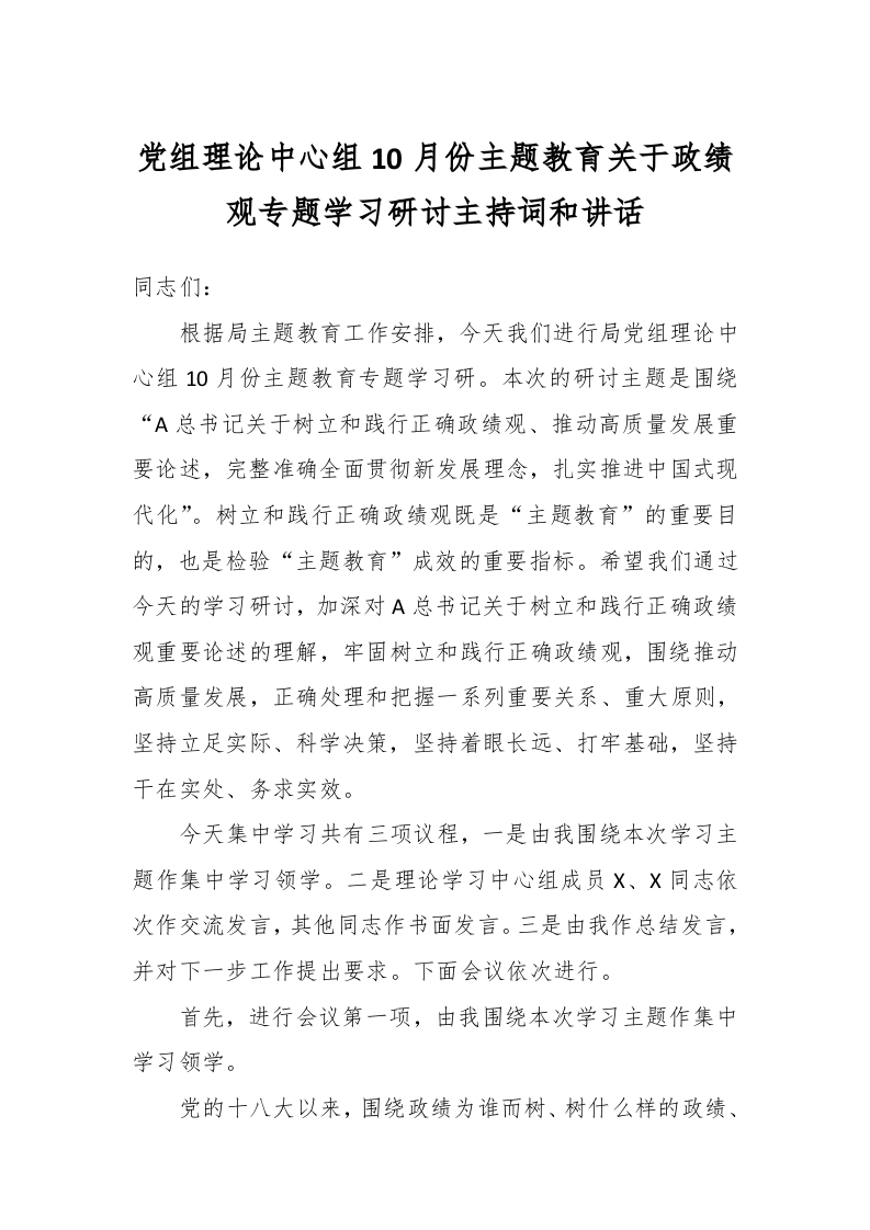 / 党组理论中心组10月份主题教育关于政绩观专题学习研讨主持词和讲话