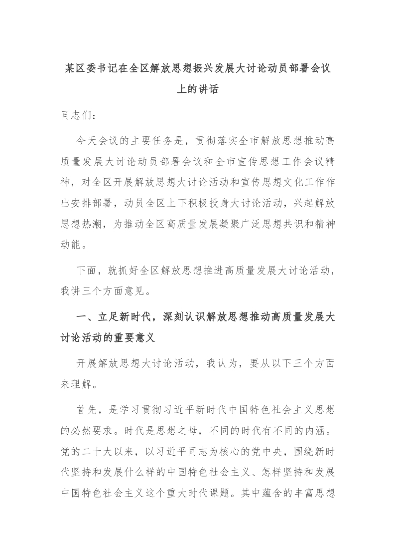 / 某区委书记在全区解放思想振兴发展大讨论动员部署会议上的讲话