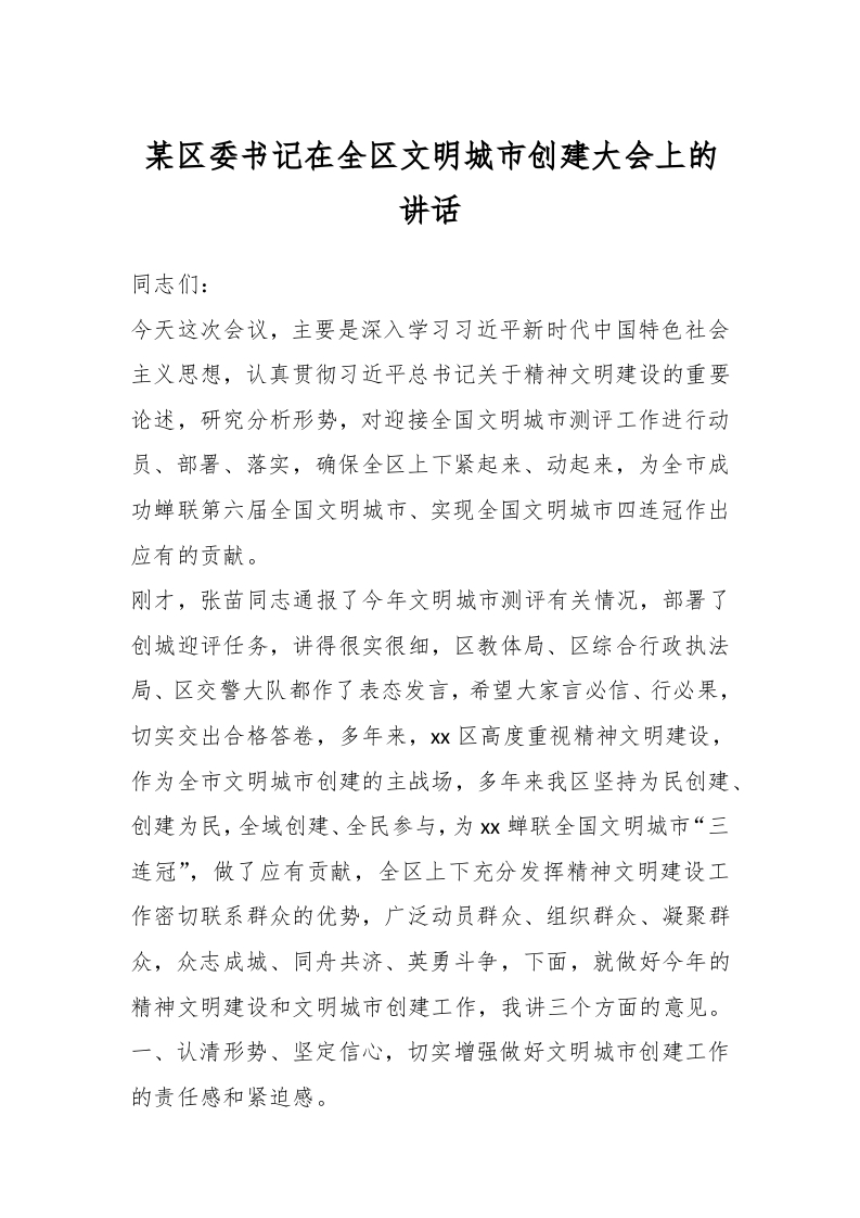 / 某区委书记在全区文明城市创建大会上的讲话