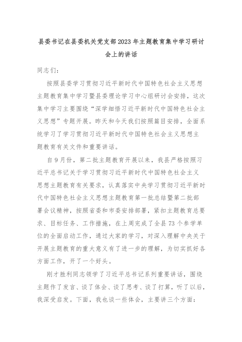 / 县委书记在县委机关党支部2023年主题教育集中学习研讨会上的讲话
