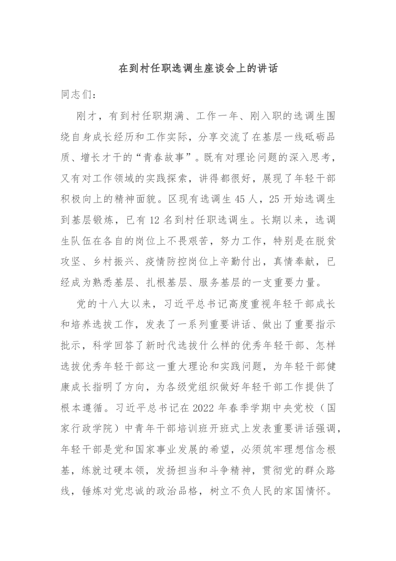 / 在到村任职选调生座谈会上的讲话