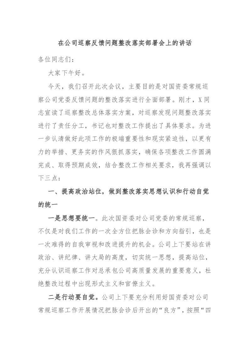 / 在公司巡察反馈问题整改落实部署会上的讲话