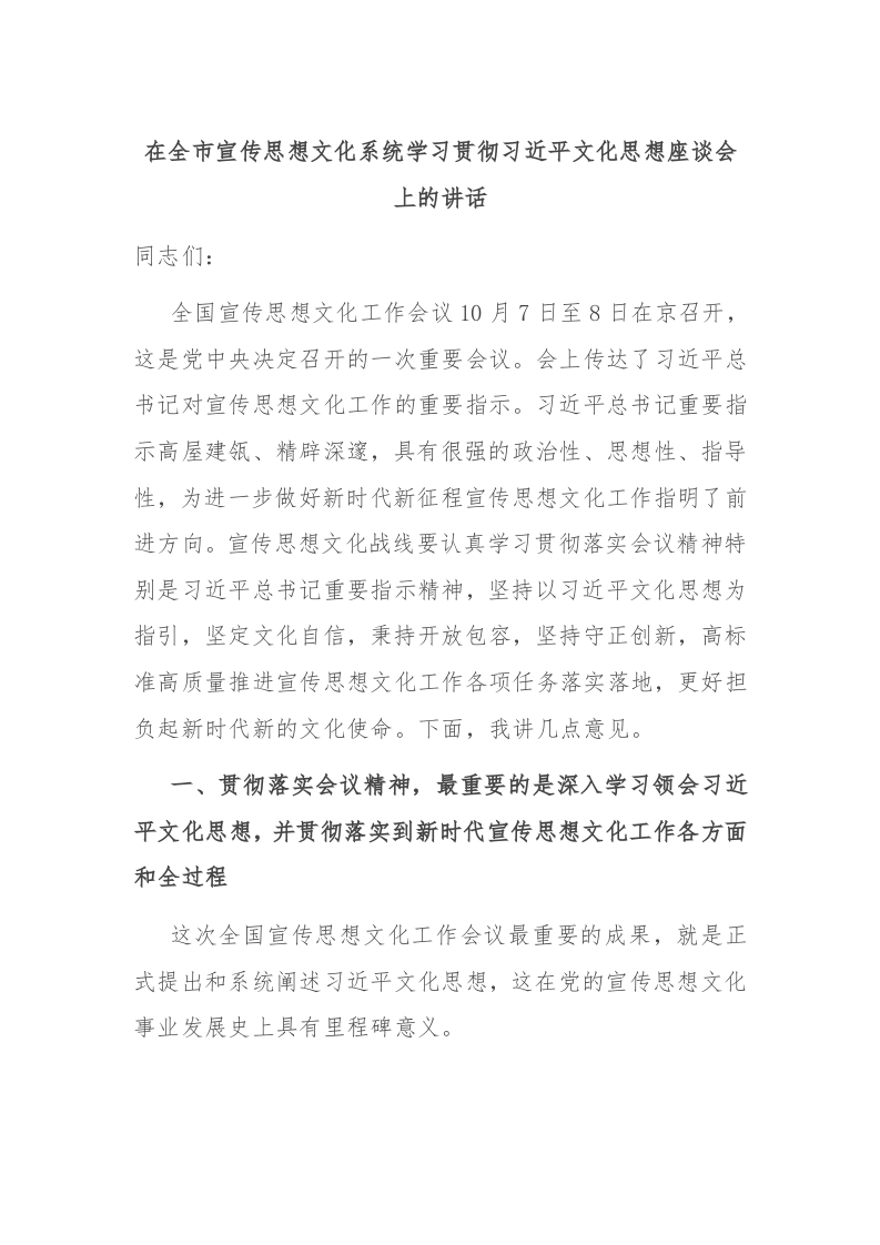 / 在全市宣传思想文化系统学习贯彻习近平文化思想座谈会上的讲话