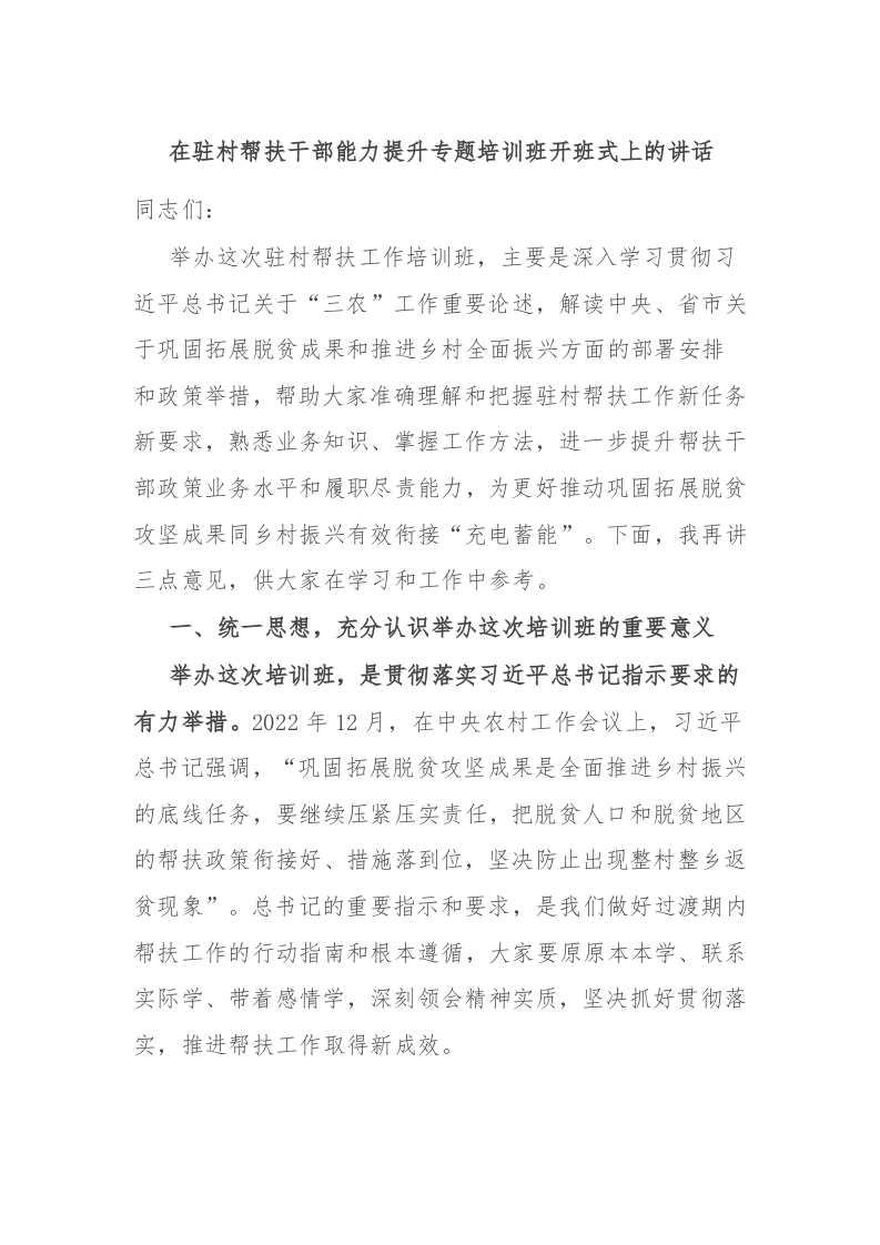 / 在驻村帮扶干部能力提升专题培训班开班式上的讲话