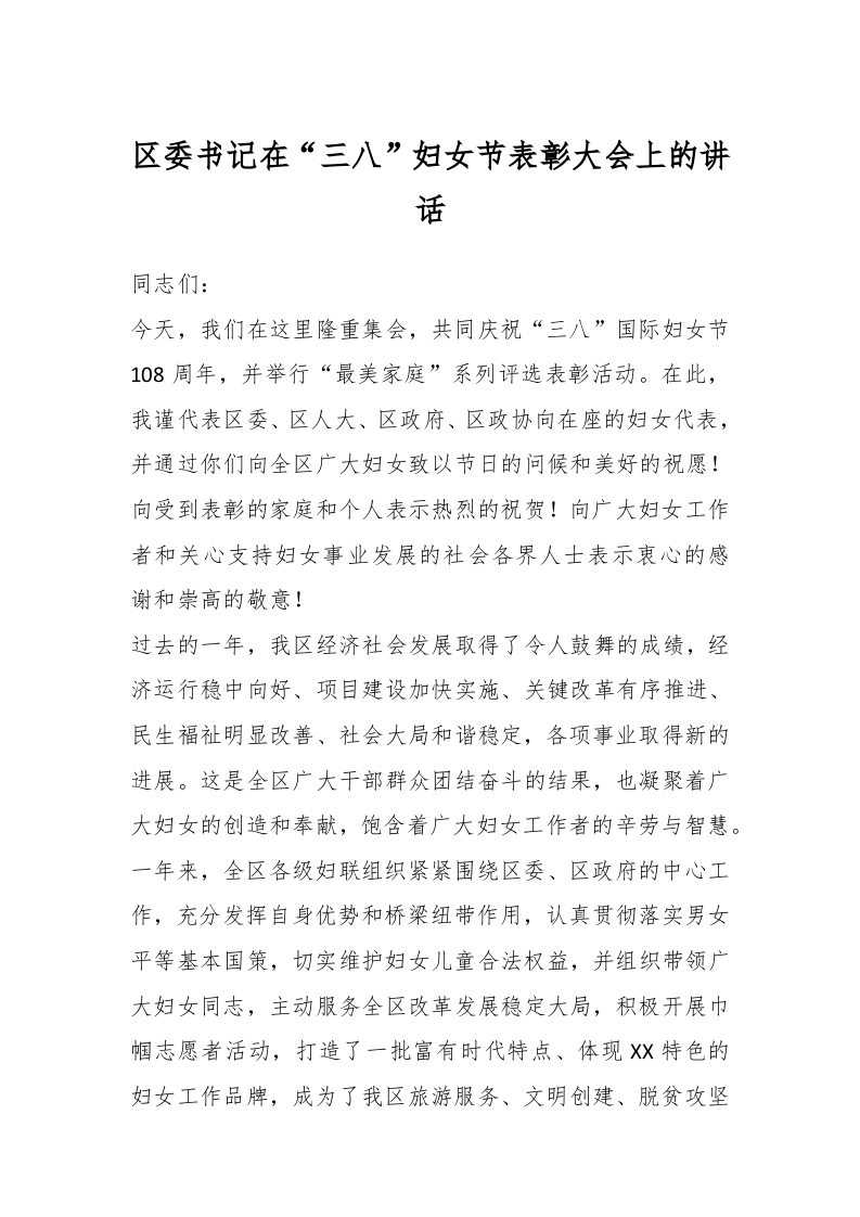 / 区委书记在“三八”妇女节表彰大会上的讲话