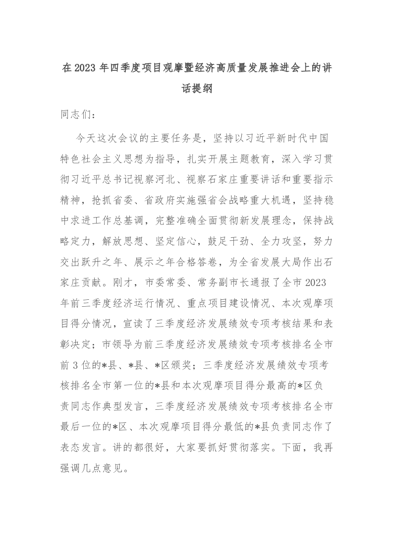 / 在2023年四季度项目观摩暨经济高质量发展推进会上的讲话提纲