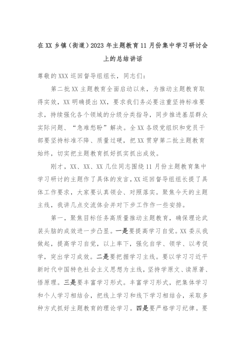 / 在XX乡镇(街道)2023年主题教育11月份集中学习研讨会上的总结讲话