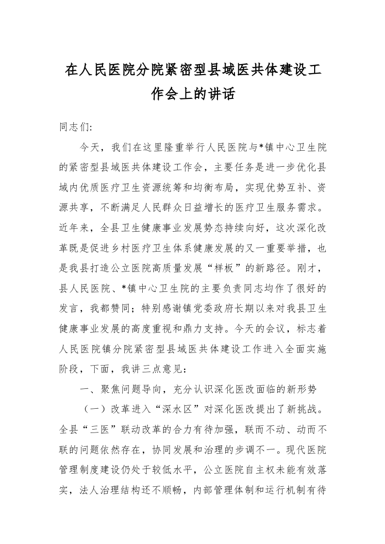 / 在人民医院分院紧密型县域医共体建设工作会上的讲话