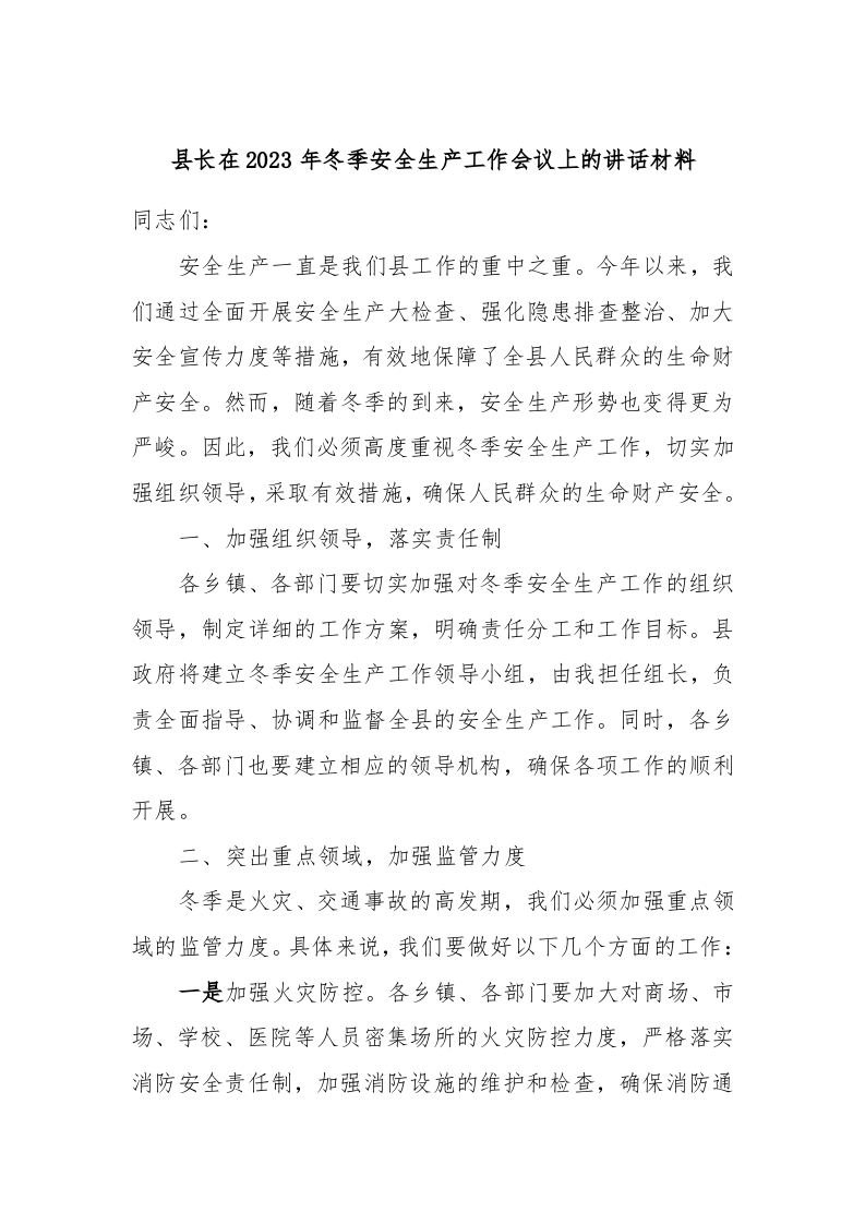 / 县长在2023年冬季安全生产工作会议上的讲话材料