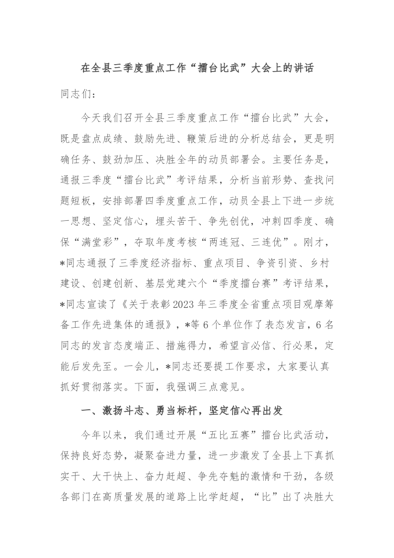 / 在全县三季度重点工作“擂台比武”大会上的讲话