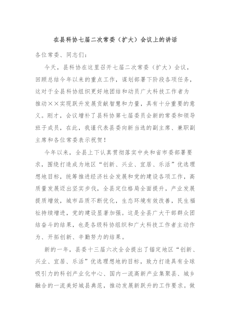 在县科协七届二次常委(扩大)会议上的讲话