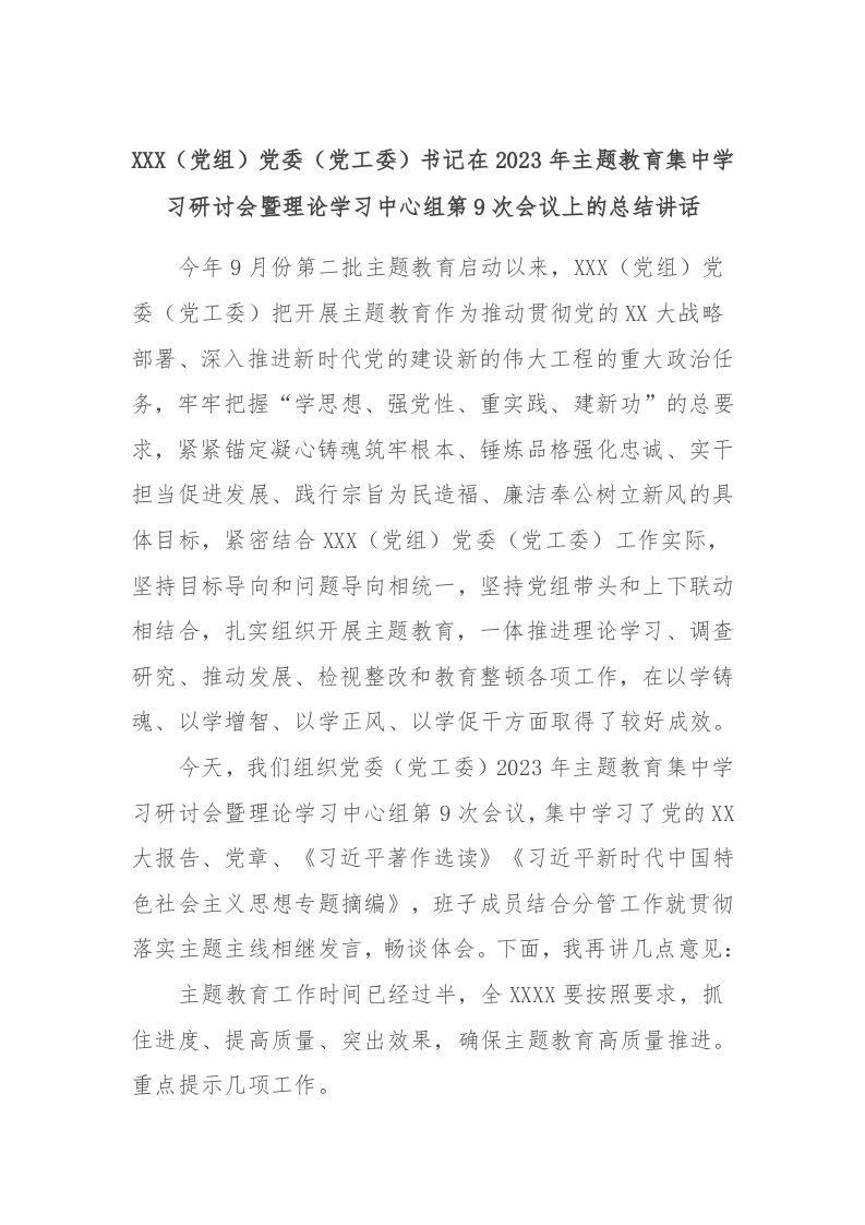 / XXX(党组)党委(党工委)书记在2023年主题教育集中学习研讨会暨理论学习中心组第9次会议上的总结讲话