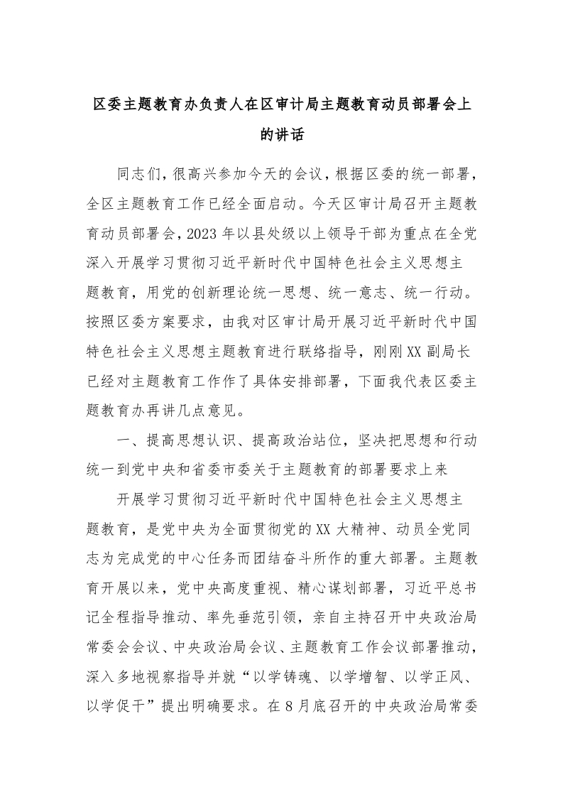 / 区委主题教育办负责人在区审计局主题教育动员部署会上的讲话
