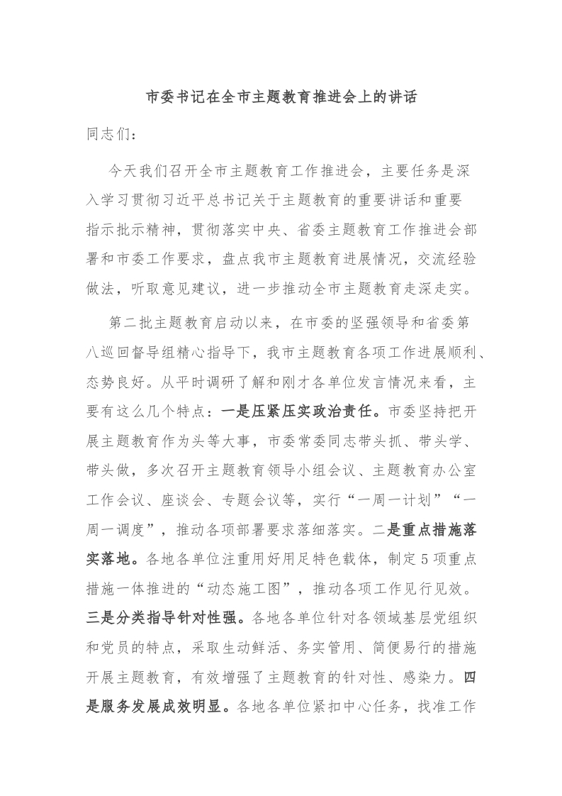 / 市委书记在全市主题教育推进会上的讲话