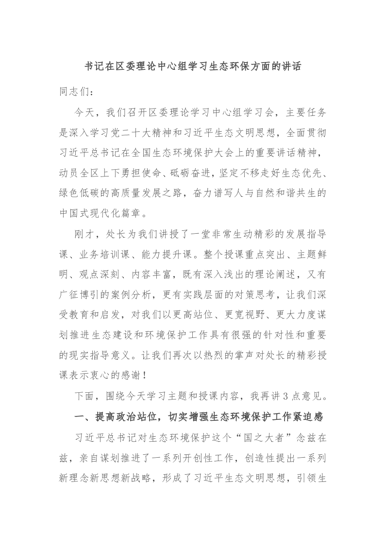 书记在区委理论中心组学习生态环保方面的讲话