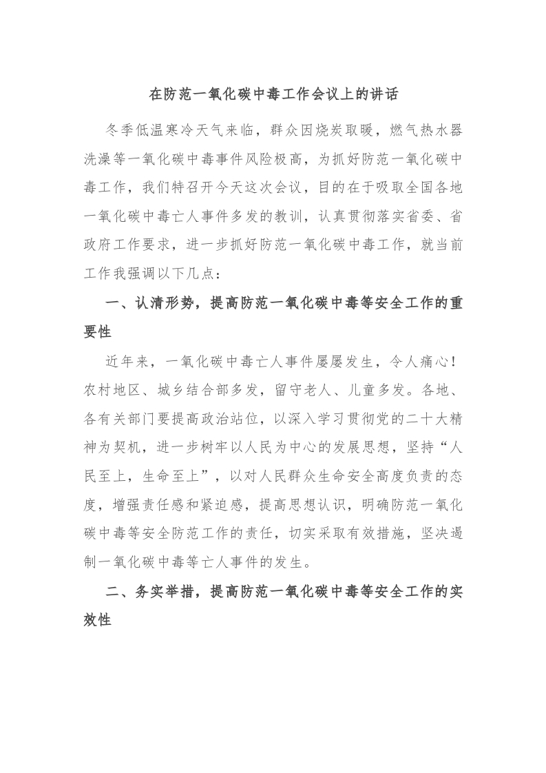 / 在防范一氧化碳中毒工作会议上的讲话