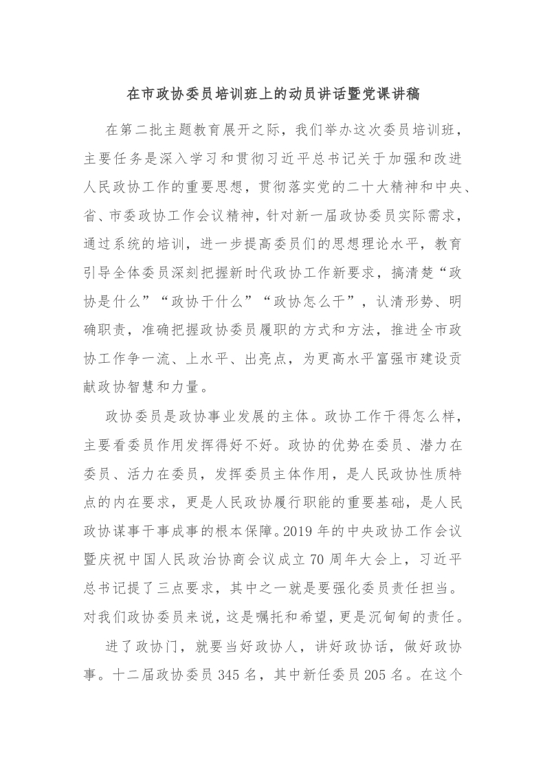 / 在市政协委员培训班上的动员讲话暨党课讲稿