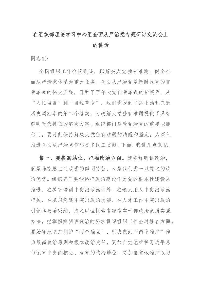 / 在组织部理论学习中心组全面从严治党专题研讨交流会上的讲话