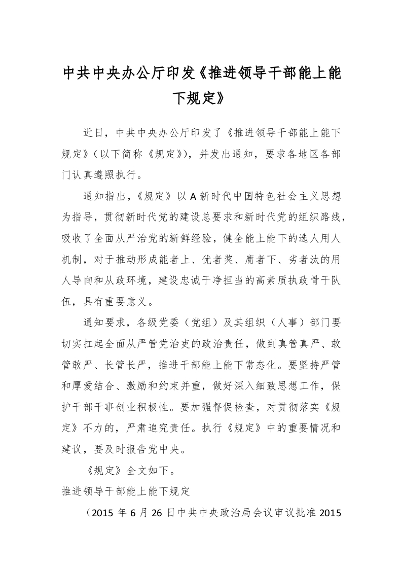 中共中央办公厅印发《推进领导干部能上能下规定》