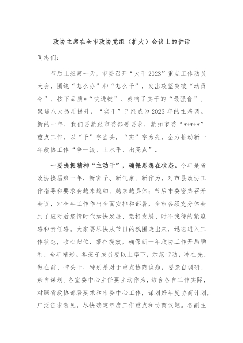 / 政协主席在全市政协党组(扩大)会议上的讲话
