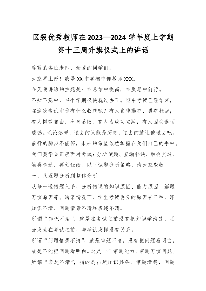 / 区级优秀教师在2023—2024学年度上学期第十三周升旗仪式上的讲话