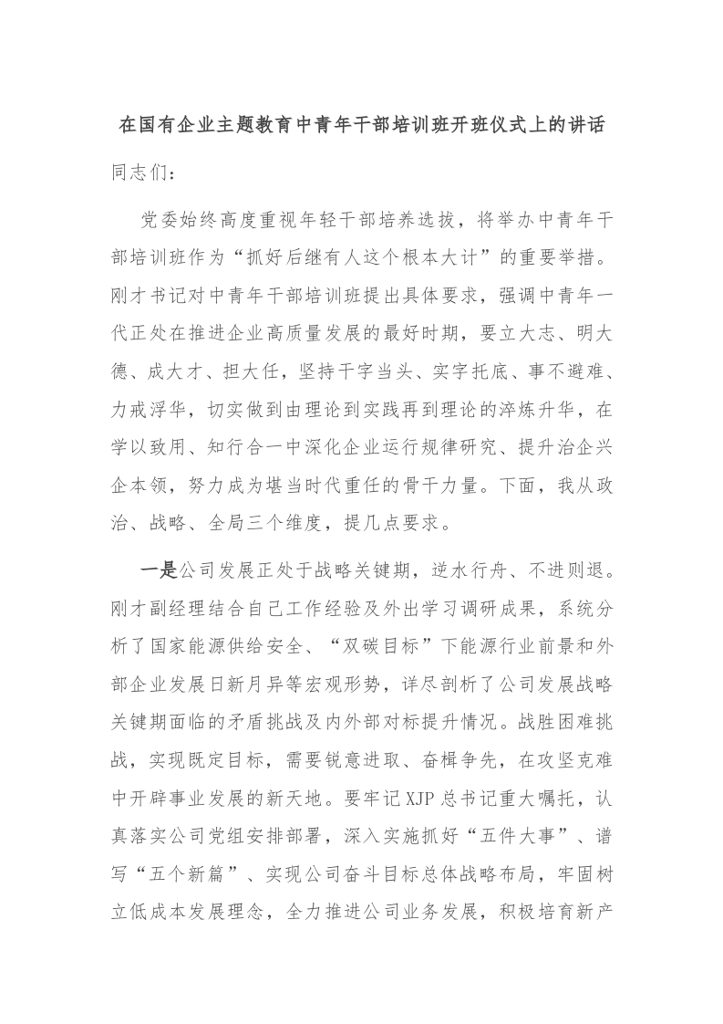 / 在国有企业主题教育中青年干部培训班开班仪式上的讲话