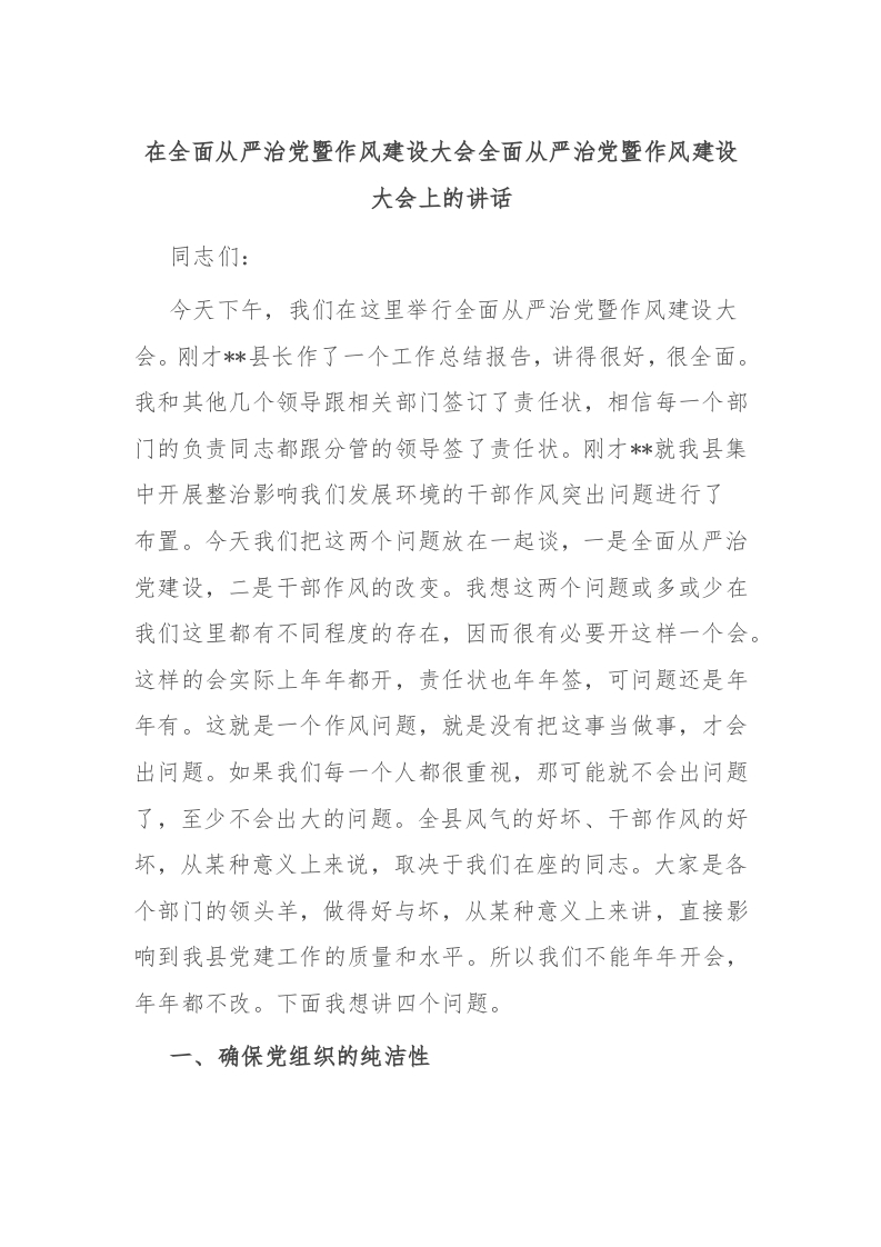/ 在全面从严治党暨作风建设大会全面从严治党暨作风建设大会上的讲话