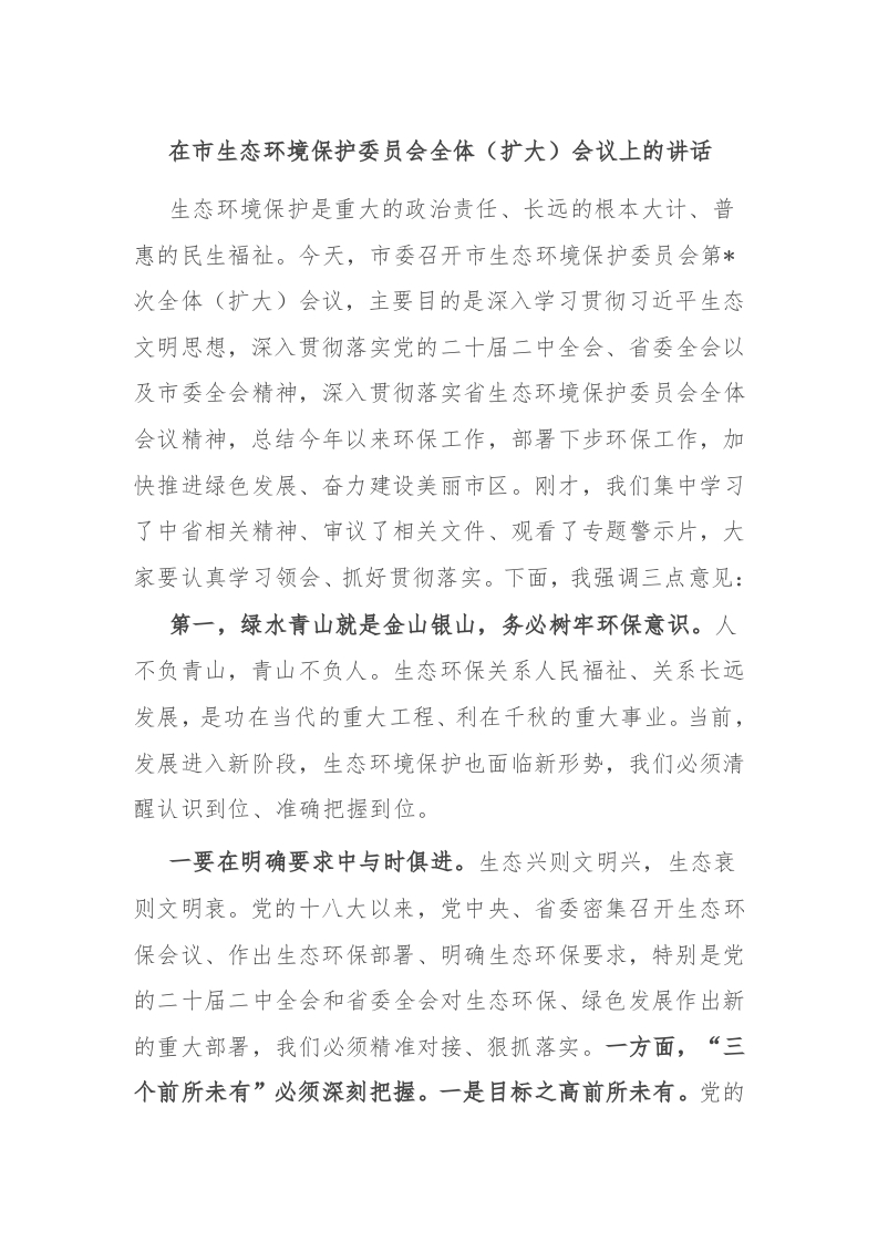 / 在市生态环境保护委员会全体(扩大)会议上的讲话