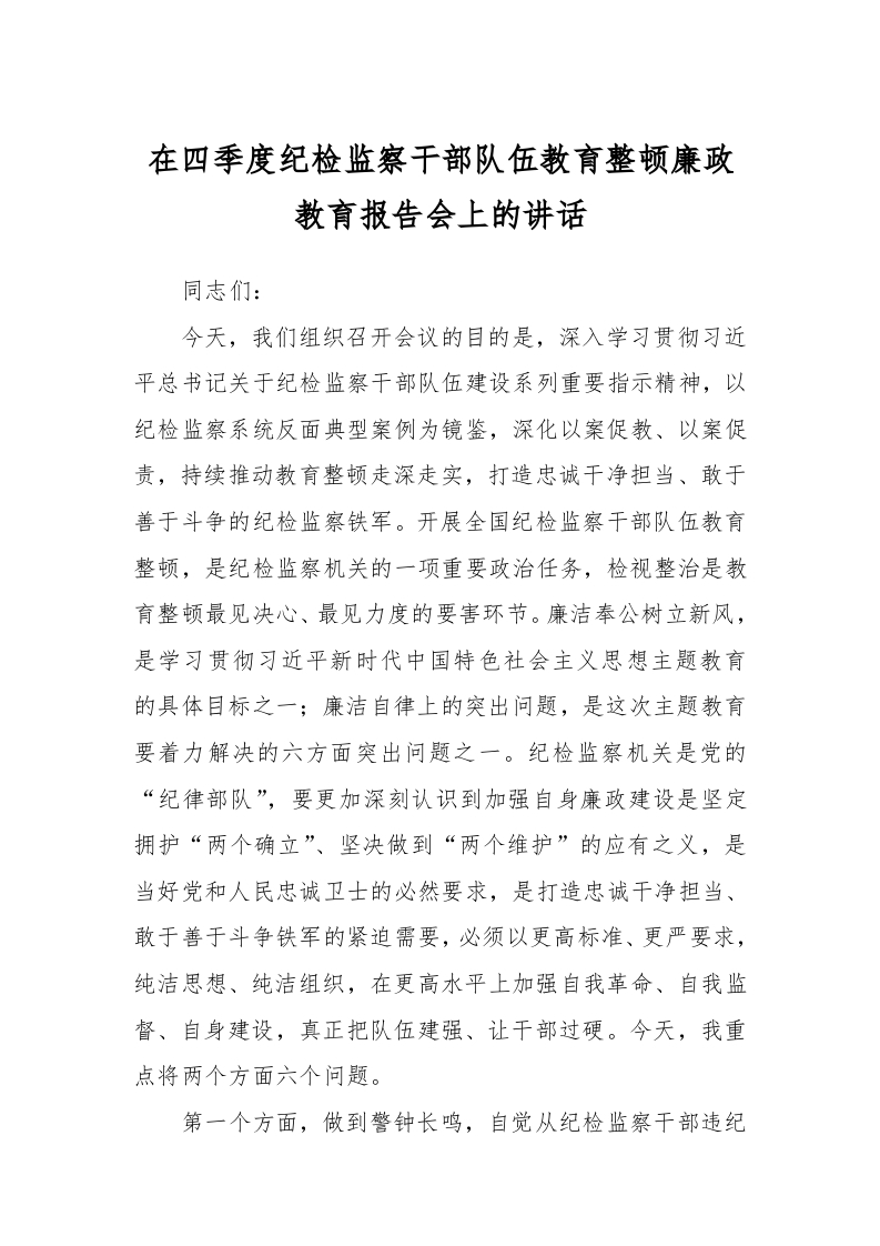 / 在四季度纪检监察干部队伍教育整顿廉政教育报告会上的讲话