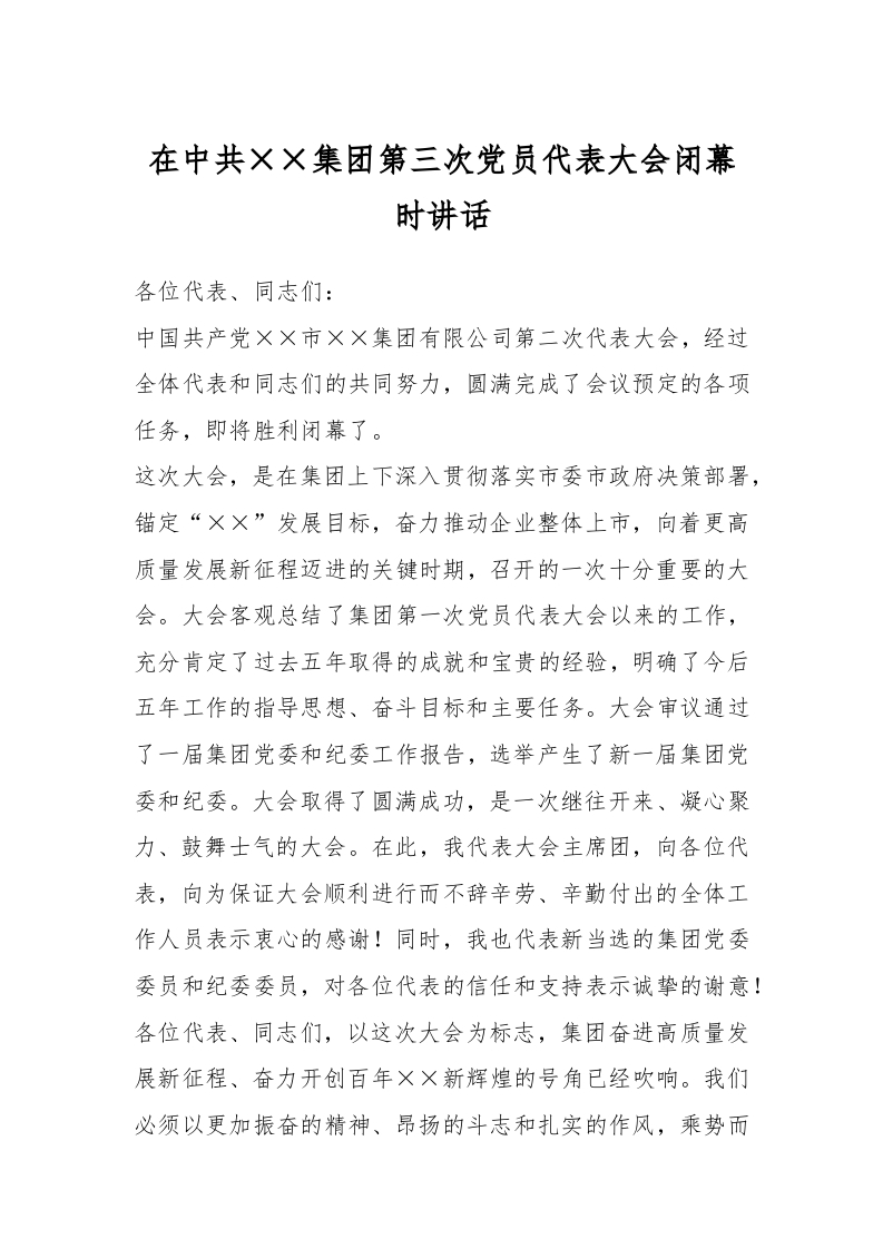 / 在中共××集团第三次党员代表大会闭幕时讲话