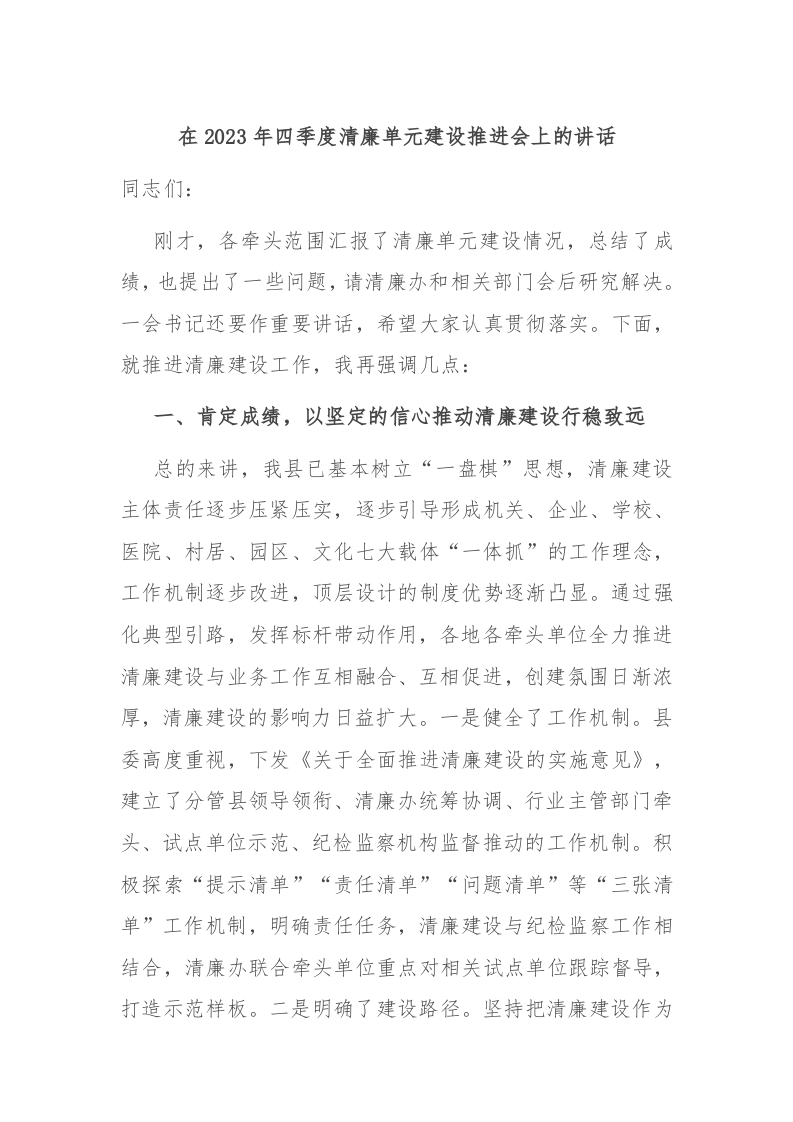 / 在2023年四季度清廉单元建设推进会上的讲话