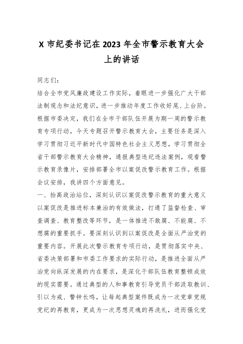 / X市纪委书记在2023年全市警示教育大会上的讲话