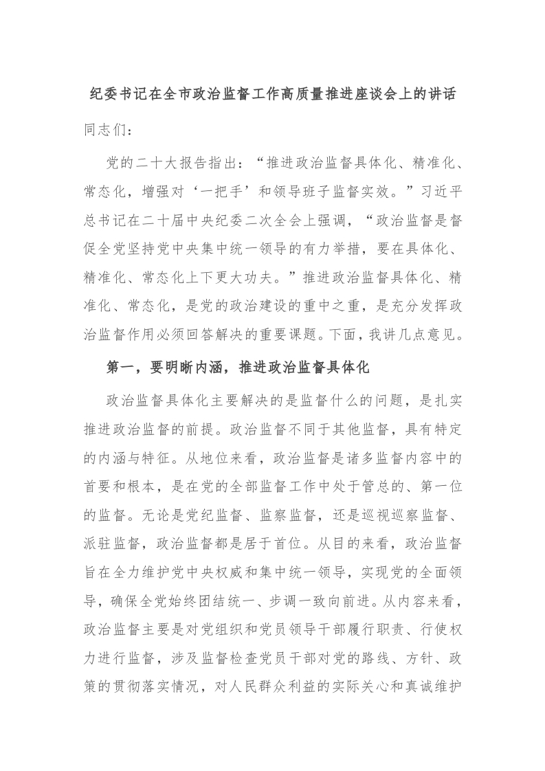 / 纪委书记在全市政治监督工作高质量推进座谈会上的讲话