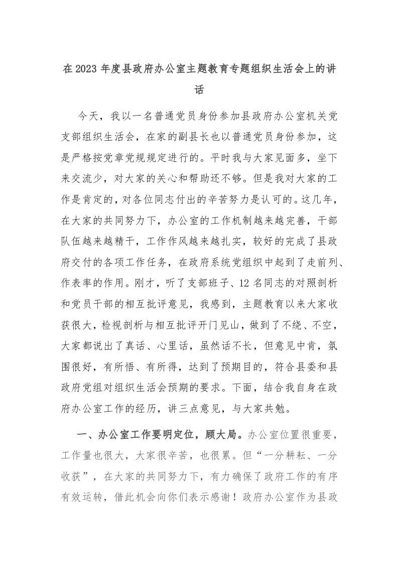 / 在2023年度县政府办公室主题教育专题组织生活会上的讲话
