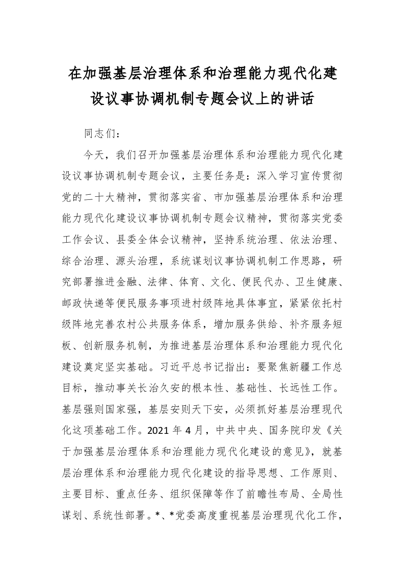 在加强基层治理体系和治理能力现代化建设议事协调机制专题会议上的讲话